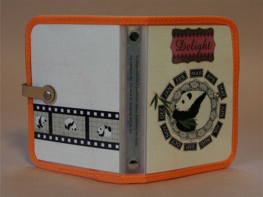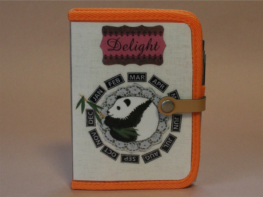 パンダ柄の手帳です。大好きな笹の葉を持ったパンダの周りは、1月から12月までの月が模様のように取り囲み、楽しい1年になること間違いなし。“delight”は人を大喜びさせる、嬉しくさせる、楽しませる、という意味です。