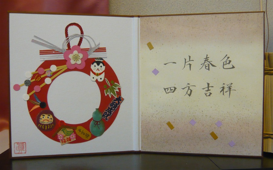 「一片春色 四方吉祥」とは、中国で新春を祝う「対聯(ドゥイ・リェン)」の一つで、「一方から春の気色、四方から良い兆し」といった意味とか。